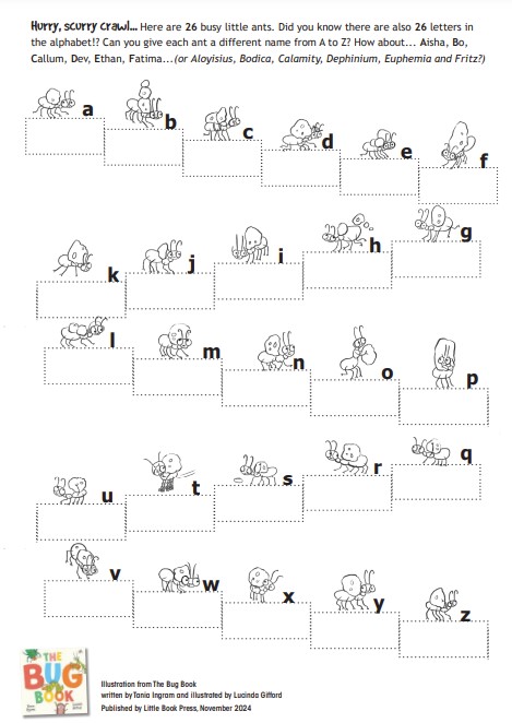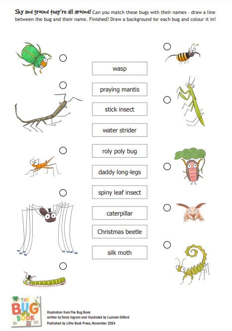 The Bug Book Activities Are you looking for some free creepy-crawly activities to accompany The Bug Book? Or perhaps a swishy-wishy colouring page? If so, check out these pages below, cleverly designed by illustrator, Lucinda Gifford. Butterfly colouring page Bug-match activity sheet Ant-names activity sheet Share this: Click to share on X (Opens in new window) X Click to share on Facebook (Opens in new window) Facebook Click to share on Pinterest (Opens in new window) Pinterest Click to print (Opens in new window) Print Click to email a link to a friend (Opens in new window) Email Like Loading...